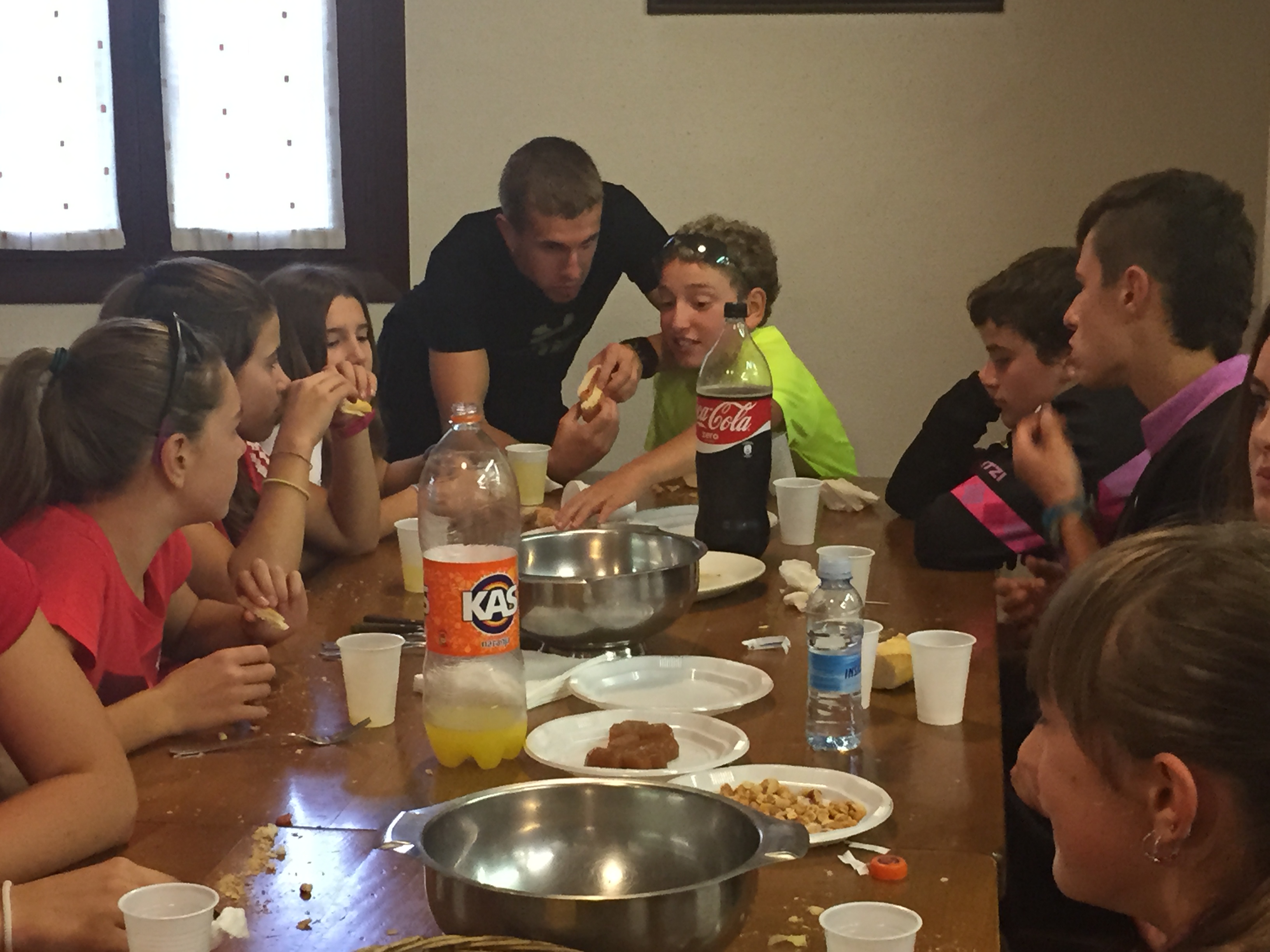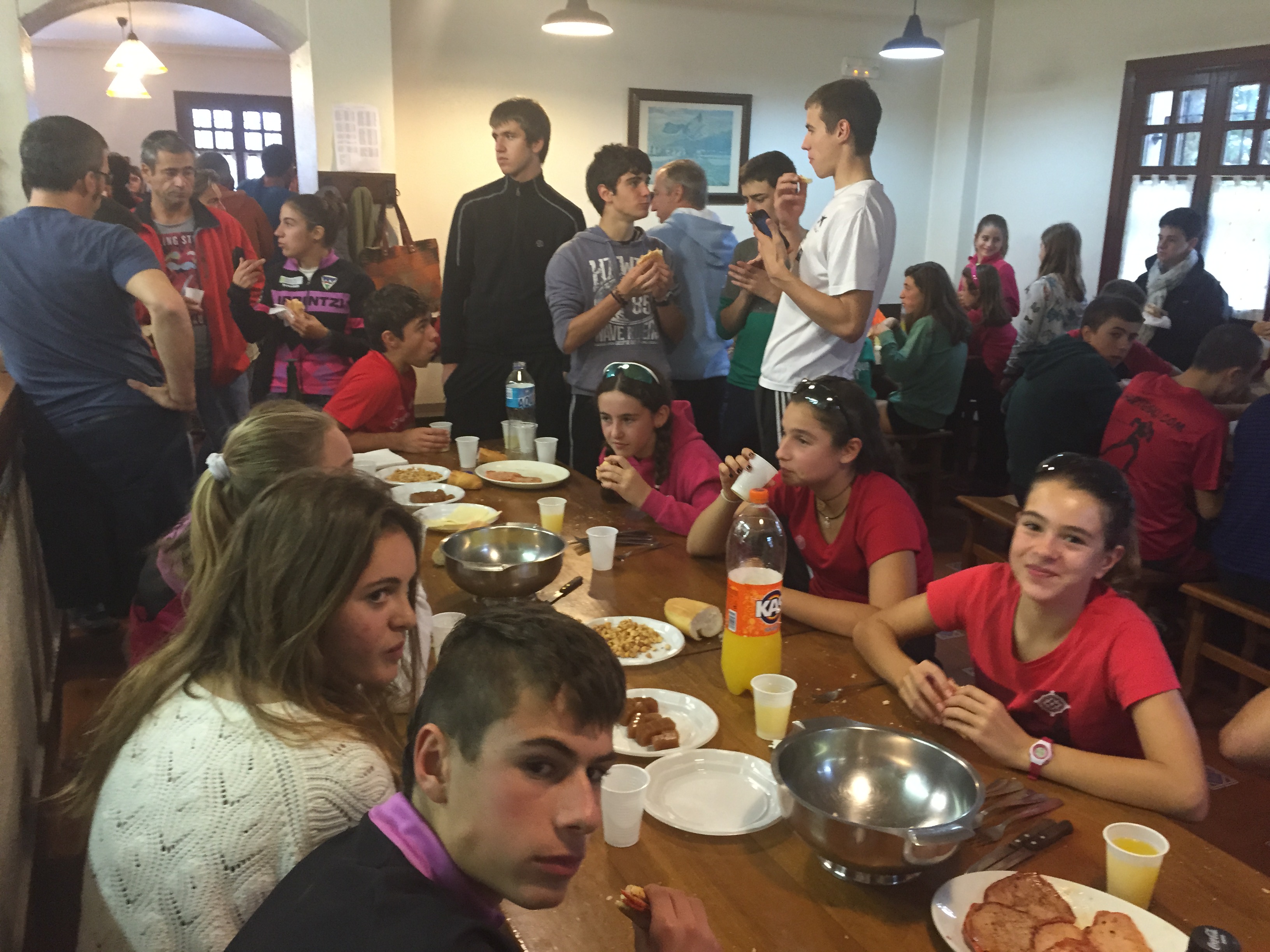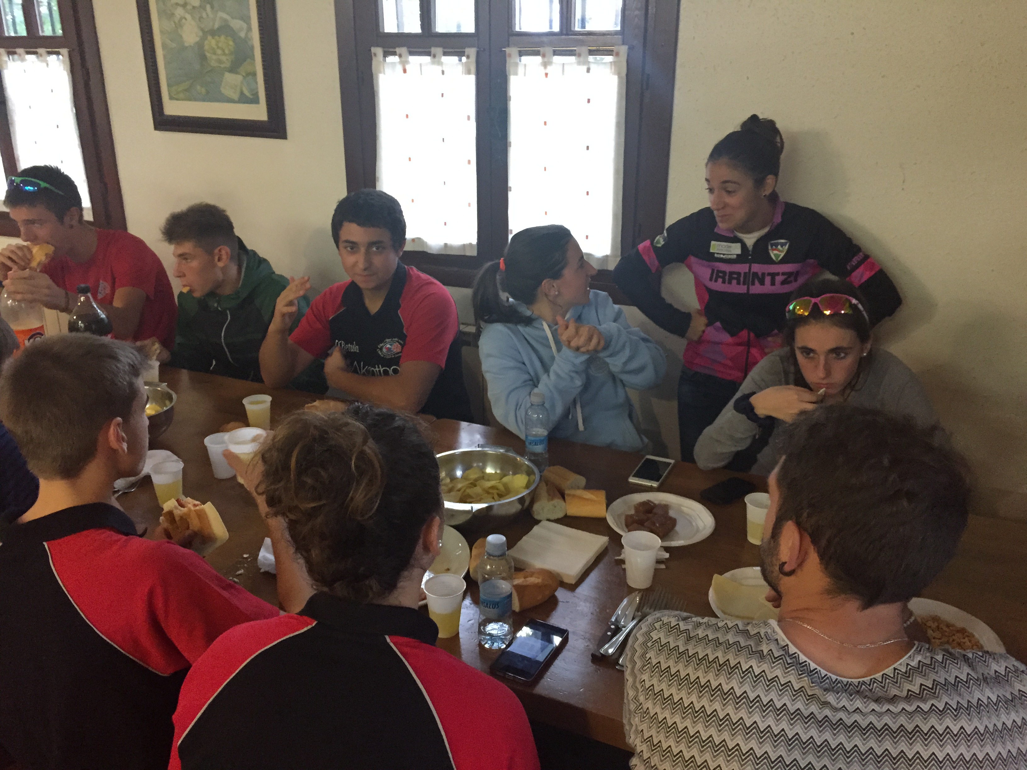En las mesas se mezclan los rosas, rojos o azules de los equipos. Se habla de la carrera, pero también de fiestas y juergas, de los estudios, de ruedas y rodamientos. Los padres y madres se suman, se merecen también el avituallamiento, que sus horas de coche y furgoneta les cuesta. Se hacen planes, viajes…una aceituna vuela de una mesa a otra, otros se hacen un selfie. Rivales pero amigos. Hay felicitaciones a quienes se han pegado carrerón y aplausos para quienes lo han pasado peor. Deportividad y compañerismo, todos y todas han sufrido lo mismo.